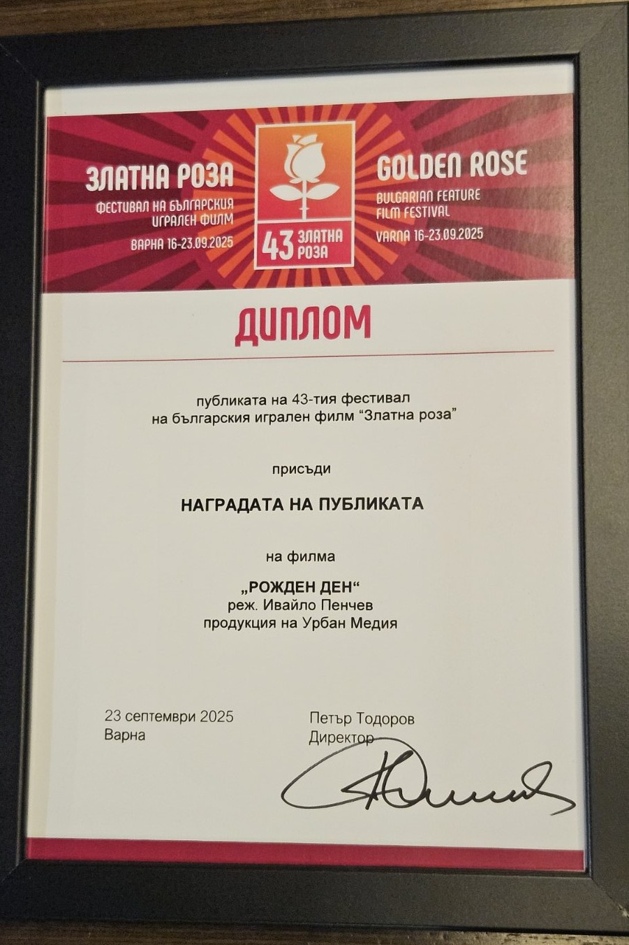 Най-новият филм на Ивайло Пенчев „Рожден ден“ спечели приза „Награда на публиката“ на 43-ото издание на фестивала на българския игрален филм „Златна роза“. Това е четвъртата поредна награда, която режисьорът печели в рамките на конкурса през годините и е абсолютен прецент в българското кино. Прожекцията на вълнуваща история по сценарий на Божан Петров и Ивайло Пенчев се проведе на 20 септември в зала 1 на Фестивален и конгресен център, Варна, като част от конкурсната програма. А вчера, 23 септември, по време на официалната церемония по награждаване, филмът бе удостоен с една от най-важните награди – тази на публиката!